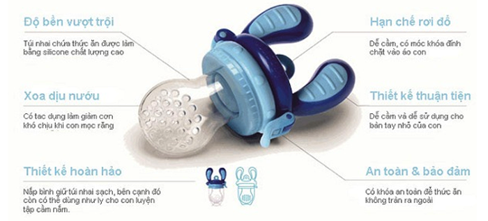- Thiết kế bề mặt đầu nhai có các lỗ nhỏ, tự tiết thức ăn một cách đều đặn phù hợp với cơ chế nhai và nuốt của từng bé, kích thích bé nhai một cách thoải mái mà hấp thu dinh dưỡng từ từ, không để thức ăn làm con bị nghẹn hay hóc.