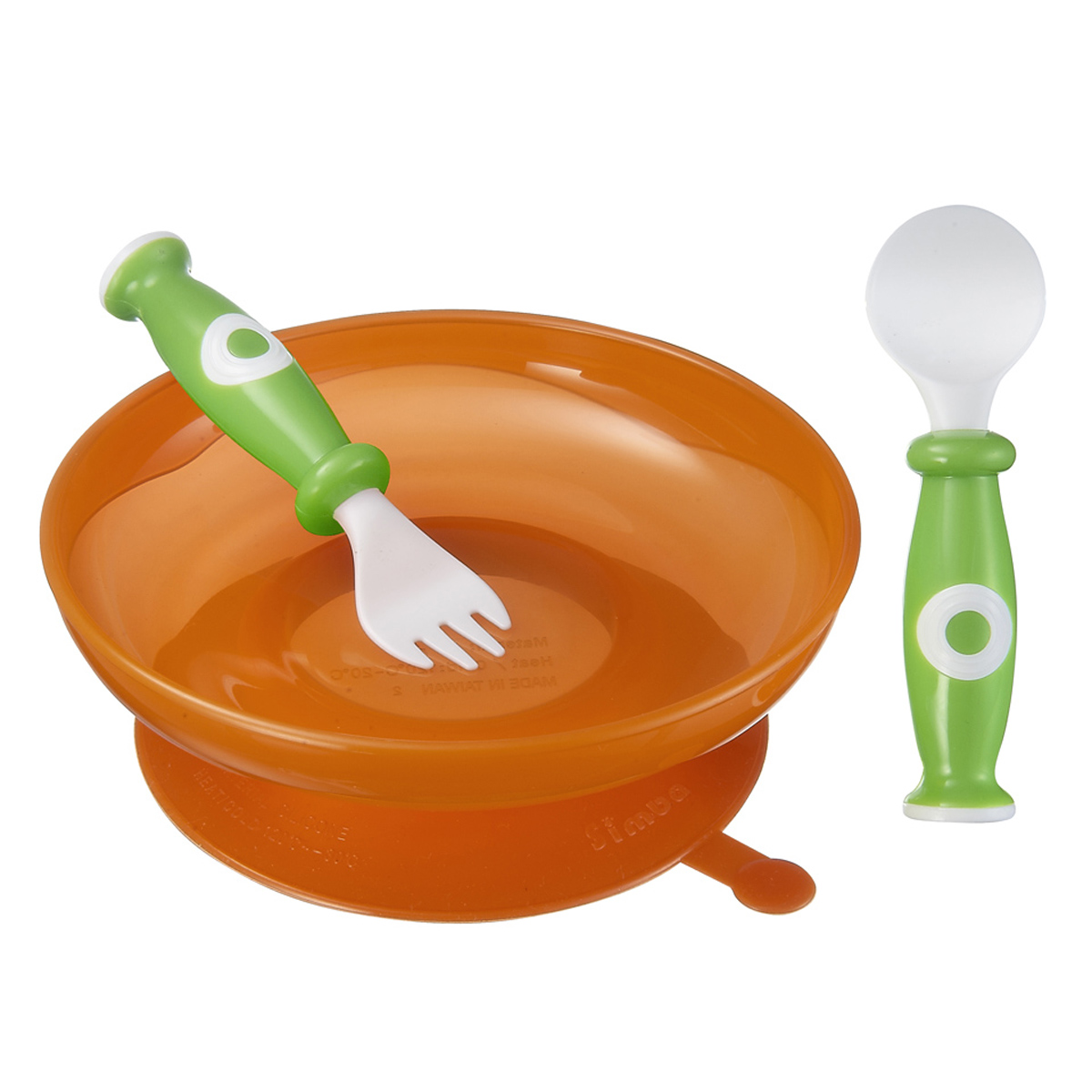 - Sản phẩm có sự kết hợp các màu sắc nổi bật như cam, xanh lá non và trắng sẽ kích thích thị giác giúp bé thêm thích thú khi tập ăn.