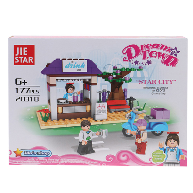 Bộ xếp hình Jie Star 20318 - Cửa hàng của Ida gồm 177 miếng ghép bằng nhựa an toàn, để bé ghép thành mô hình cửa hàng bán đồ uống .... Đồ chơi lắp ráp giúp bé phát triển trí tuệ, tư duy cũng như khả năng sáng tạo, bé có thể xây dựng nên những câu chuyện của riêng mình.