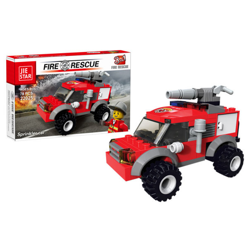 Bộ xếp hình Jie Star 22025 - Xe cứu hỏa gồm 78 miếng ghép bằng nhựa an toàn, để bé ghép thành 3 mô hình khác nhau như xe cứu hỏa, xe địa hình.... Đồ chơi lắp ráp giúp bé phát triển trí tuệ, tư duy cũng như khả năng sáng tạo, bé có thể xây dựng nên những câu chuyện của riêng mình.