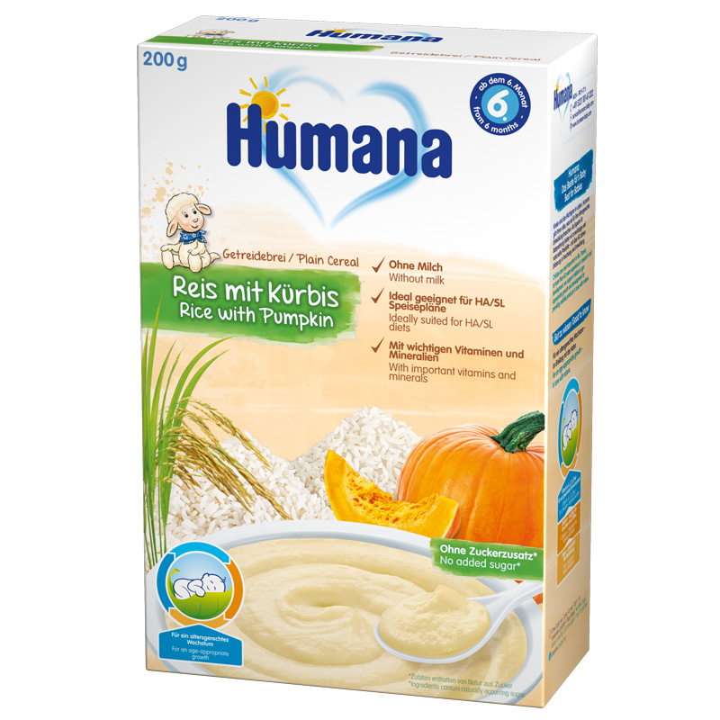 Thông tin chi tiết về sản phẩm Bột ăn dặm Humana gạo, bí đỏ cho trẻ dị ứng đạm sữa 6+