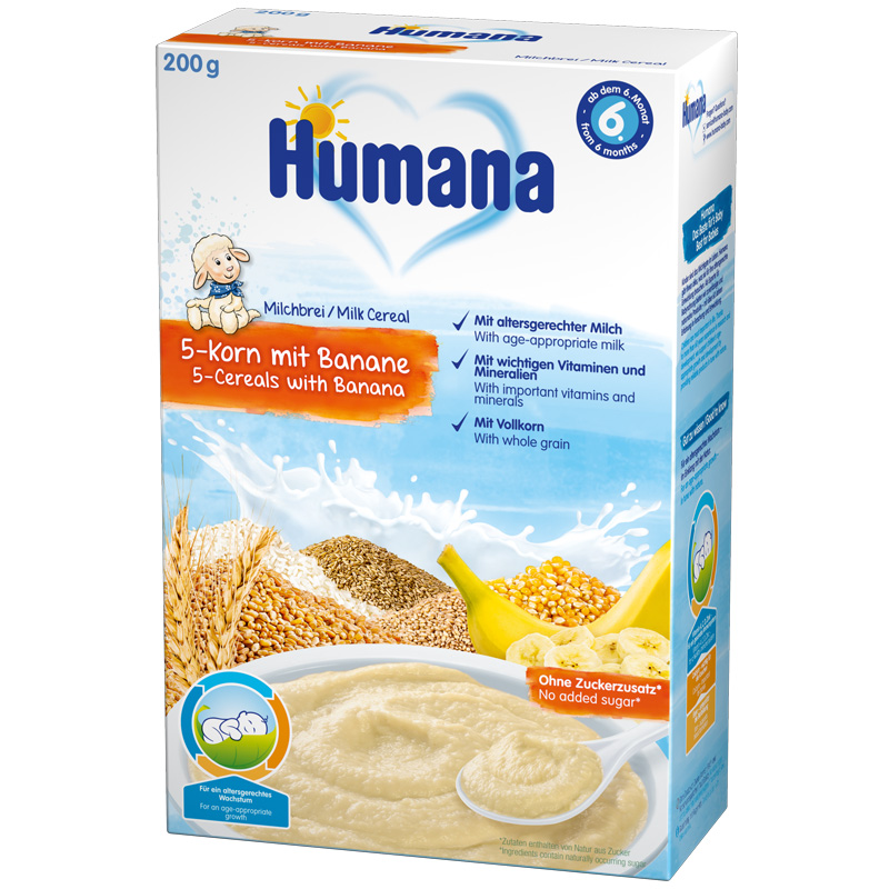 Bột ăn dặm Humana sữa, ngũ cốc, chuối 6+ giúp cho bé có một bữa ăn dặm hoàn hảo. Sản phẩm có hương vị thơm ngon từ sữa, ngũ cốc, chuối sẽ kích thích vị giác của bé, giúp các bé không còn cảm giác biếng ăn mỗi khi tới giờ ăn nữa. Trong sản phẩm chứa nhiều Vitamin giúp phát triển thể chất một cách toàn diện, đặc biệt có chứa Vitamin D hỗ trợ hấp thu dinh dưỡng tốt hơn dành cho các bé khó hấp thu