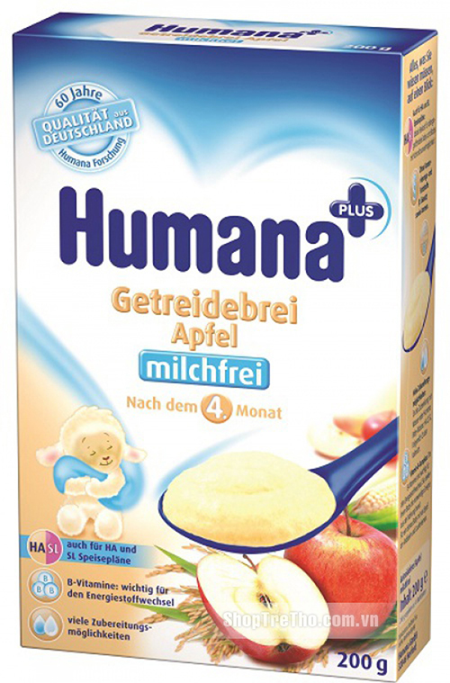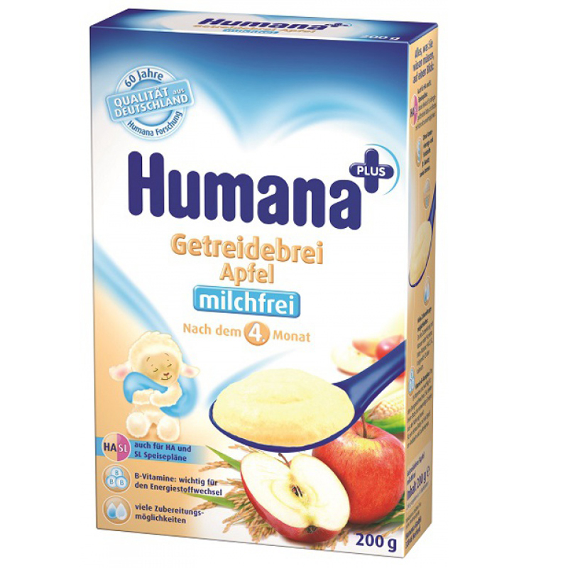 bột ăn dặm Humana Táo cung cấp đầy đủ các chất bột, đạm, béo, vitamin và khoáng chất, đặc biệt không chứa sữa bò, không chứa gluten (milk-free, gluten-free) nên vừa có thể dùng cho trẻ bình thường vừa rất thích hợp cho các trẻ có nguy cơ dị ứng, giúp trẻ có những bữa ăn đầu đời an toàn và đủ dưỡng chất để tăng trưởng và phát triển cả thể chất và trí tuệ bằng một công thức dinh dưỡng dành riêng cho lứa tuổi ăn dặm.