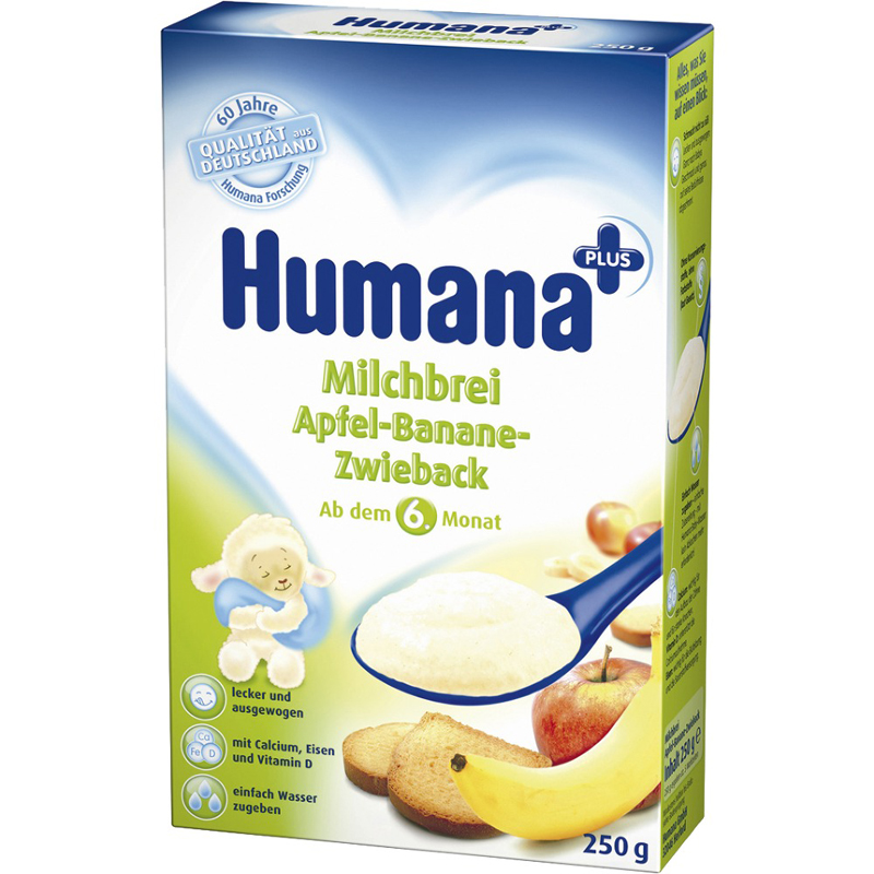 Bột sữa ăn dặm Humana cung cấp đầy đủ các chất bột, đạm, béo, vitamin và khoáng chất, giúp trẻ có những bữa ăn đầu đời an toàn và đủ dưỡng chất để tăng trưởng và phát triển cả thể chất và trí tuệ bằng một công thức dinh dưỡng dành riêng cho lứa tuổi ăn dặm.