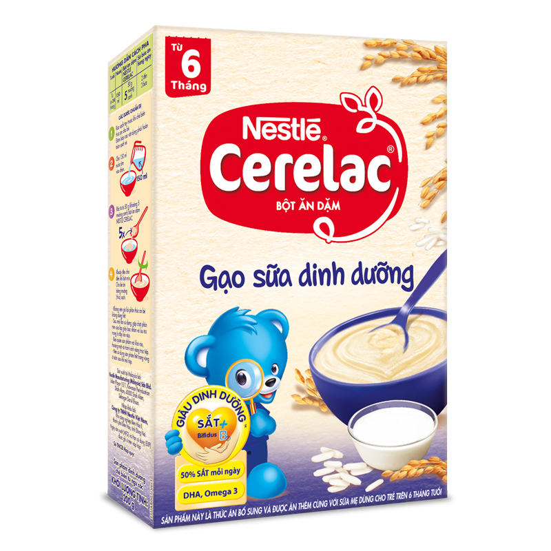 Bột ăn dặm Nestle Cerelac - gạo sữa dinh dưỡng là ngũ cốc thơm ngon cho bé mới tập ăn. Sản phẩm cung cấp chất dinh dưỡng cần thiết cho nhu cầu tăng trưởng và phát triển của bé, đồng thời phù hợp với hệ tiêu hóa của bé. Đặc biệt, sản phẩm với cải tiến mới, bổ sung thêm sắt, tốt cho trí não của bé.