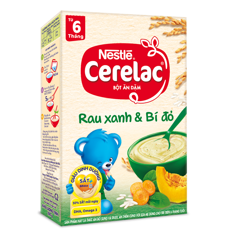 - Bột ăn dặm Nestlé CERELAC giàu dinh dưỡng với phức hợp Iron+, giàu sắt, kẽm, DHA, Omega 3, Canxi, Vitamin A,C,D và khoáng chất. Ngoài ra còn được bổ sung thêm vi sinh vật có lợi Bifidus BL giúp tăng cường sức đề kháng cho trẻ.
