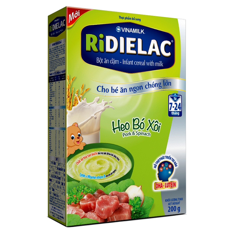Bột ăn dặm Ridielac heo cải bó xôi (200g) được phát triển theo tiêu chuẩn dinh dưỡng quốc tế Codex và nhu cầu dinh dưỡng khuyến nghị RNI của bộ y tế Việt Nam, giúp bổ sung vi chất dinh dưỡng, hỗ trợ sức khỏe của bé yêu. Sản phẩm là thực phẩm bổ sung dành cho bé từ 7 - 24 tháng.