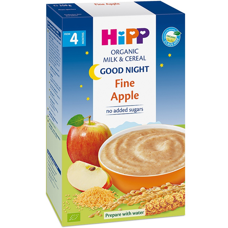 Bột dinh dưỡng HiPP Chúc ngủ ngon vị sữa, táo tây 250g là thức ăn dặm cho bé từ 4 tháng, chứa 44% sữa bột tăng trưởng, bổ sung chất xơ giúp bé dễ tiêu hóa, bổ sung canxi cho hệ xương và răng của bé.