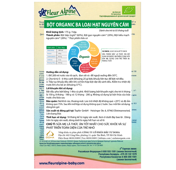 Bột Organic ba loại hạt nguyên cám Fleur Alpine là bột ăn dặm duy nhất trên thị trường được sản xuất từ ngũ cốc nguyên hạt, sử dụng tất cả các bộ phận của hạt bao gồm: nội nhũ, mầm và lớp cám được chế biến thành bột nghiền mịn. Cho nên bột có hương vị thơm ngon đồng thời giữ được các sinh tố và và nguyên tố vi lượng, tốt cho hệ tiêu hóa và sức khỏe của bé.