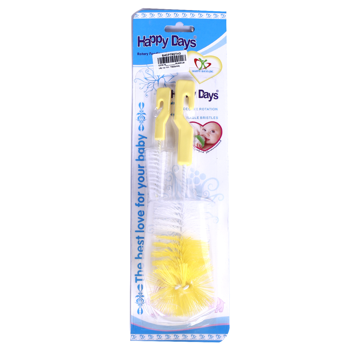 - Cọ rửa bình sữa Happy Days có thân thon dài nên có thể chùi sạch tận đáy bình sữa. Ngoài ra, tay cầm có thể xoay được rất linh hoạt nên bạn có thể làm sạch thành bình bên trong một cách dễ dàng mà không cần xoay tay quá nhiều.