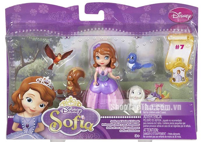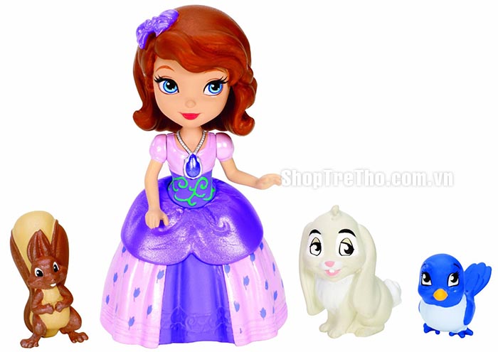 Búp bê công chúa Sofia có đôi mắt to tròn, hồn nhiên hút hồn các bé gái, trên đầu đính một cái nơ màu tím phù hợp với mái tóc ngắn dễ thương. Trang phục búp bê mặc là một bộ đầm công chúa cổ tích, chân váy có hai tầng, phần trên làm nổi bật hơn bằng màu tím đậm, phần dưới là họa tiết xen kẽ giữa màu hồng và màu tím và hình những bông hoa. Trên cổ nàng đeo một sợi dây chuyền đính hạt to tròn màu tím nổi bật, khiến nàng trở nên lộng lẫy hơn.