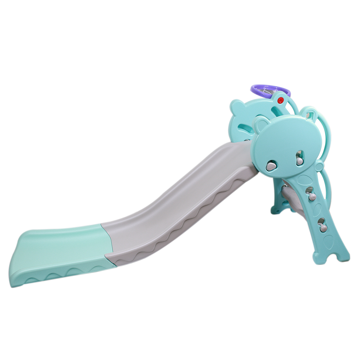 Cầu trượt hình thú mini có bóng rổ (nhiều màu) với thiết kế máng trượt dài, độ dốc vừa phải, kết hợp với rổ ném bóng cho bé thực hiện nhiều hành động và thao tác khác nhau tăng cường rèn luyện thể lực cho trẻ. Thiết kế máng trượt cân bằng, hai bên rãnh có tay vịn khiến bé không bị hụt hẫng khi trượt xuống và không bị lệch ra ngoài.