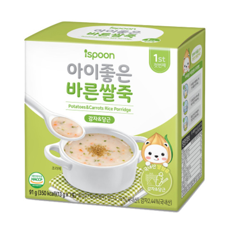 Cháo ăn dặm Ispoon vị khoai và cà rốt 91g (6M+) được sản xuất tại Hàn Quốc với nguyên liệu từ gạo hữu cơ mềm dẻo, khoai tây và cà rốt. Sản phẩm có hương vị thơm ngon, đảm bảo nhu cầu dinh dưỡng và phát triển của trẻ trong giai đoạn ăn dặm sau 6 tháng tuổi.