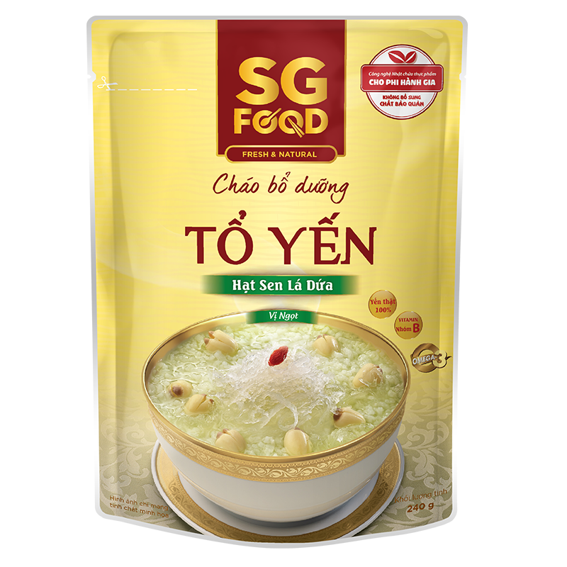 Cháo bổ dưỡng SG Food hạt sen lá dứa cung cấp nhiều Omega 3 tự nhiên từ cá hồi cần thiết cho sự phát triển trí não của trẻ, ngăn ngừa các bệnh tim mạch cho người lớn tuổi. Canxi và chất xơ tự nhiên từ các loại rau củ giúp ngăn ngừa bệnh loãng xương và tốt cho hệ tiêu hóa. Sản phẩm hoàn toàn không có chất bảo quản, đảm bảo an toàn cho sức khỏe người dùng.
