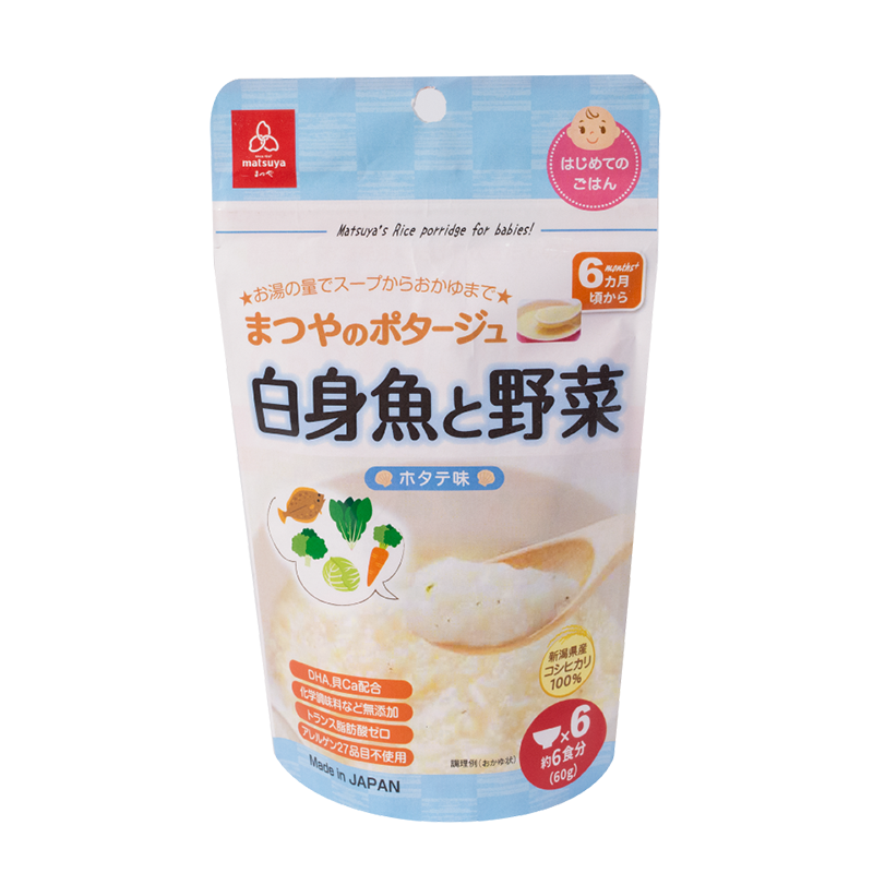 Cháo gạo Koshihikari vị sò điệp với thịt trắng và rau Matsuya 60g (6M+) với nguyên liệu và nguồn thịt và rau tươi ngon như cá bơn, súp lơ xanh, rau chân vịt, cải bắp, cà rốt, muối, chiết xuất sò điệp được lựa chọn một cách kỹ càng, cẩn thận. Sản phẩm được đóng gói với trọng lượng lớn hơn, bé dùng được lâu hơn, tiết kiệm cho mẹ.