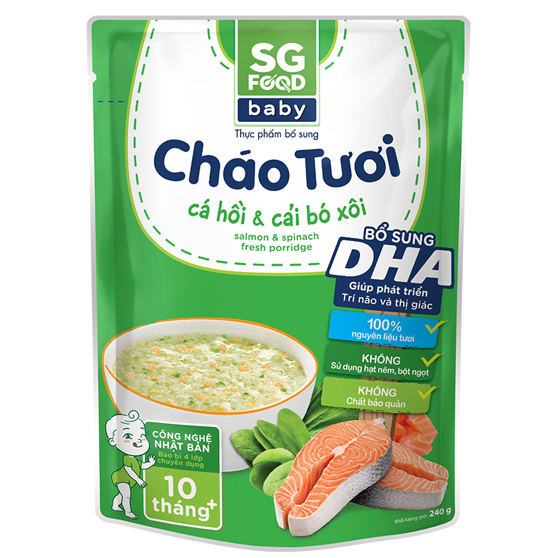 Cháo tươi Baby SG Food - Cá hồi & cải bó xôi 240g (10M+) được sản xuất từ nguyên liệu tươi ngon, bằng công nghệ khép kín của Nhật Bản đảm bảo giữ nguyên hương vị thơm ngon và không làm mất chất dinh dưỡng. Đặc biệt, sản phẩm có thể ăn liền nên rất tiện dụng để mẹ mang theo cho bé ăn khi đi du lịch hay về quê.