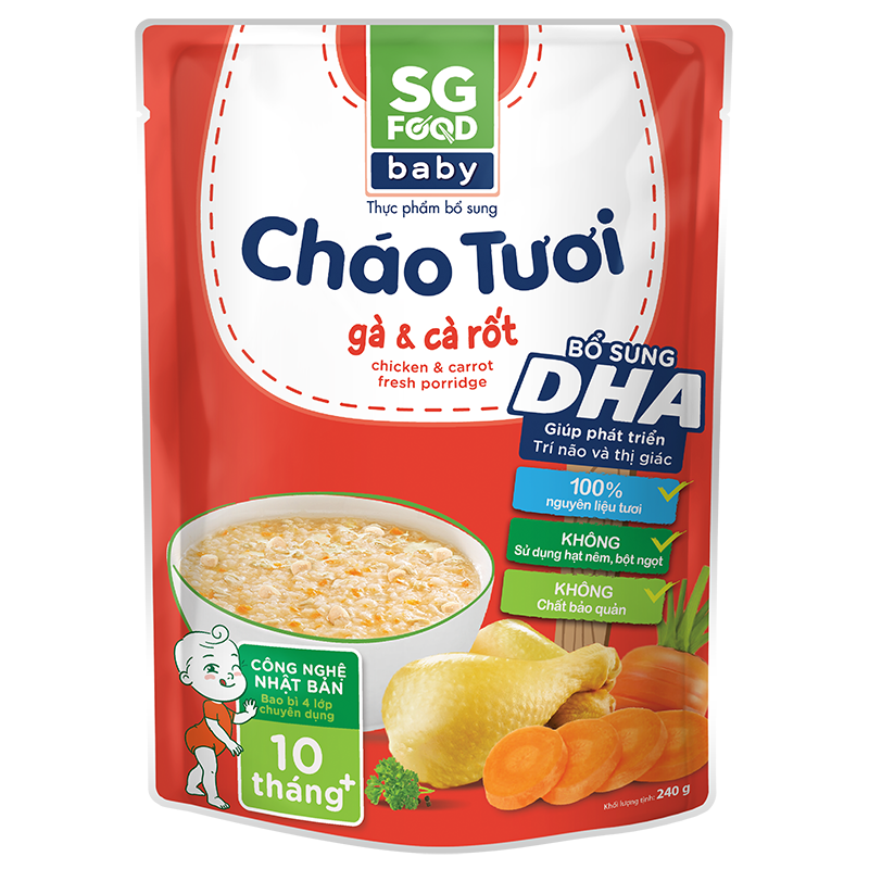 Cháo tươi Baby SG Food - Gà, cà rốt 240g (10M+) với đầy đủ dinh dưỡng: đạm, bột đường, béo, xơ, vitamin và khoáng chất cần thiết, mang đến bữa ăn thơm ngon cho bé từ 10 tháng trở lên. Sản phẩm sử dụng 100% nguồn nguyên liệu tươi ngon, không chất bảo quản nhờ bao bì đa lớp chuyên dụng kết hợp công nghệ Nhật Bản.