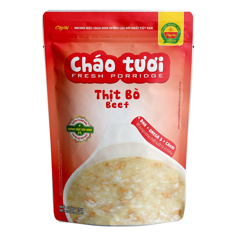 Cháo tươi Cây Thị thịt bò 260g (7M+) được làm từ 100% nguyên liệu tươi ngon dành cho bé trên 7 tháng tuổi. Sản phẩm ăn liền, cung cấp nhiều Omega 3 và giàu Vitamin nhóm B (B1,B6) giúp hạn chế tình trạng biếng ăn, hấp thu kém ở trẻ. Cháo tươi hoàn toàn không có chất bảo quản, chế biến trên dây chuyền công nghệ hiện đại, giữ nguyên được hương vị tươi ngon, đảm bảo hàm lượng dinh dưỡng và an toàn cho người tiêu dùng.