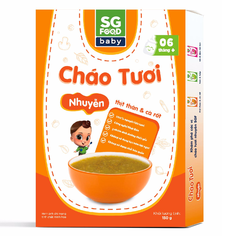 - Cháo tươi nhuyễn Sài Gòn Food (SG Food) được làm từ 100% nguyên liệu tươi ngon, đảm bảo đạt chuẩn an toàn vệ sinh thực phẩm của Bộ Y Tế