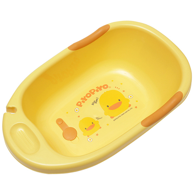Chậu tắm Piyo Piyo có nắp đóng mở lỗ thoát nước màu vàng ở đáy chậu rất tiện lợi.
