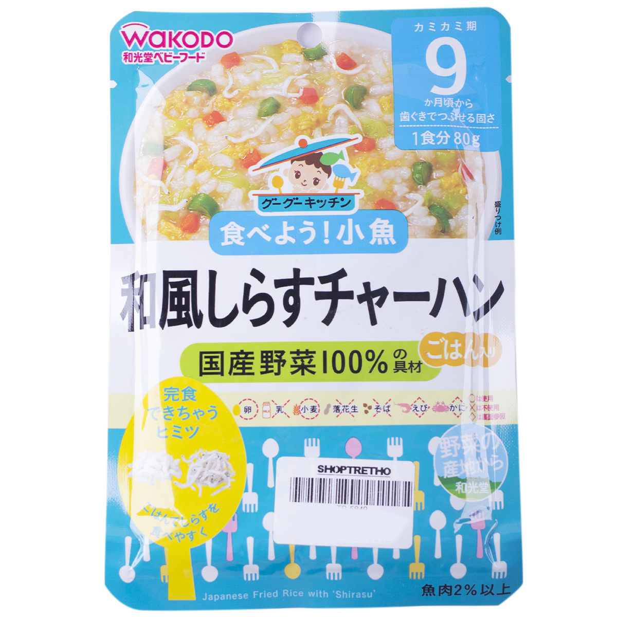 Cơm chiên với cá trắng Wakodo được làm từ cá trắng và rau củ, gạo Nhật Bản giúp cung cấp chất đạm, chất béo, chất tinh bột bổ sung năng lượng cần thiết cho trẻ từ 9 tháng tuổi trở lên. Các loại thực phẩm đều đã được làm chín, chỉ cần hâm nóng là có thể ăn được.