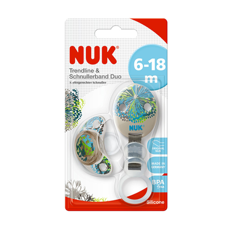 Dây đeo ty ngậm Nuk tránh cho ty ngậm khỏi bị rơi, bị lấm đất hoặc bị mất. Móc đeo cũng tạo điều kiện giữ ty ngậm được chắc chắn hơn. Bộ sản phẩm gồm: 1 dây đeo, 1 ty giả dành cho bé từ 6 đến 18 tháng, bằng chất liệu nhựa an toàn, BFA free.