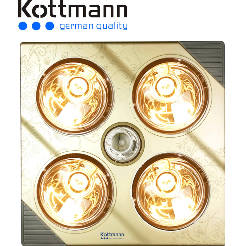 Đèn sưởi Kottmann 4 bóng K4B-G là dòng đèn sưởi nhà tắm cao cấp với 4 bóng vàng sang trọng mang đến cho nhà tắm của bạn thêm màu sắc mới. Hơn thế, đèn sưởi ngoài chức năng sưởi ấm còn giúp diệt khuẩn nhằm bảo vệ tốt nhất cho sức khỏe của mọi thành viên trong gia đình hiệu quả nhất. Đèn đươc mạ kim cương nhân tạo không chói mắt, không đốt cháy oxy, bóng đèn có màu vàng bởi vậy đã hạn chế việc gây chói mắt so với các dòng khác.