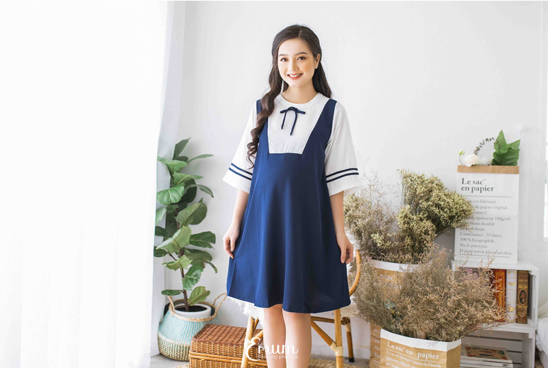Đầm bầu cổ nơ phối trắng Emum được thiết kế với kích thước rộng rãi có đến 4 size: S, M, L, XL giúp Mẹ dễ dàng lựa chọn trang phục từ những tuần thai đầu tiên đến giai đoạn sinh nở mà không phải lo lắng về việc tìm kích thước đồ bầu sao cho phù hợp. Bộ đầm bầu này có thiết kế dạng yếm dây kết hợp với chiếc áo thun cotton trắng bên trong tạo cho Mẹ sự tươi tắn và tràn đầy sức sống