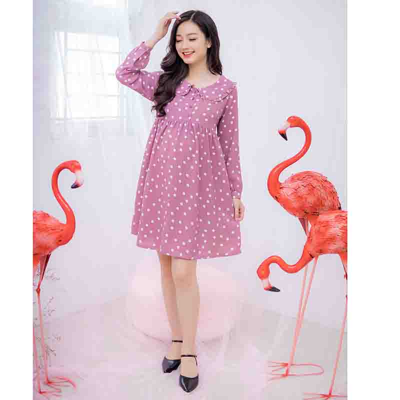 Váy bầu Emum với họa tiết chấm bi và cổ sen điệu đà
