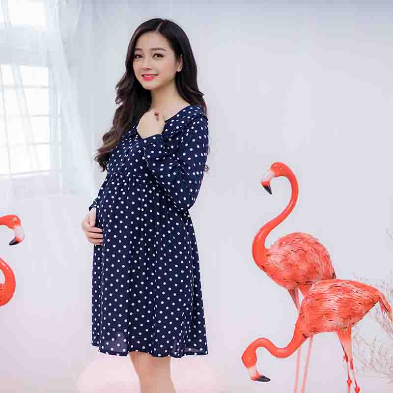 Váy bầu Emum với họa tiết chấm bi và cổ sen điệu đà