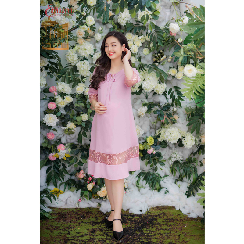 - Đầm bầu cổ tròn màu hồng ruốc Emum được thiết kế theo form mẹ bầu, giúp mẹ bầu trông thon gọn nhất