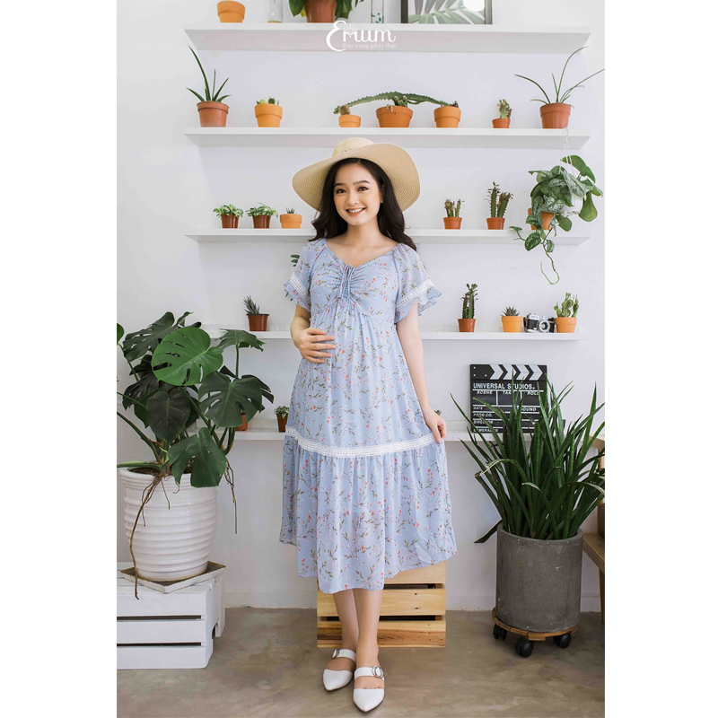 Đầm bầu phối ren nhún ngực xanh da trời Emum mang đến sự quý phái và sang trọng
