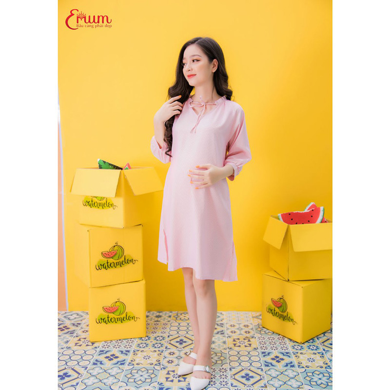 Đầm bầu Emum sơ mi suông tay bo cổ nơ sọc đỏ được thiết kế với màu sắc rất hài hòa và tươi sáng cho người mẹ thêm sức sống mỗi khi khoác bộ đầm bầu lên người
