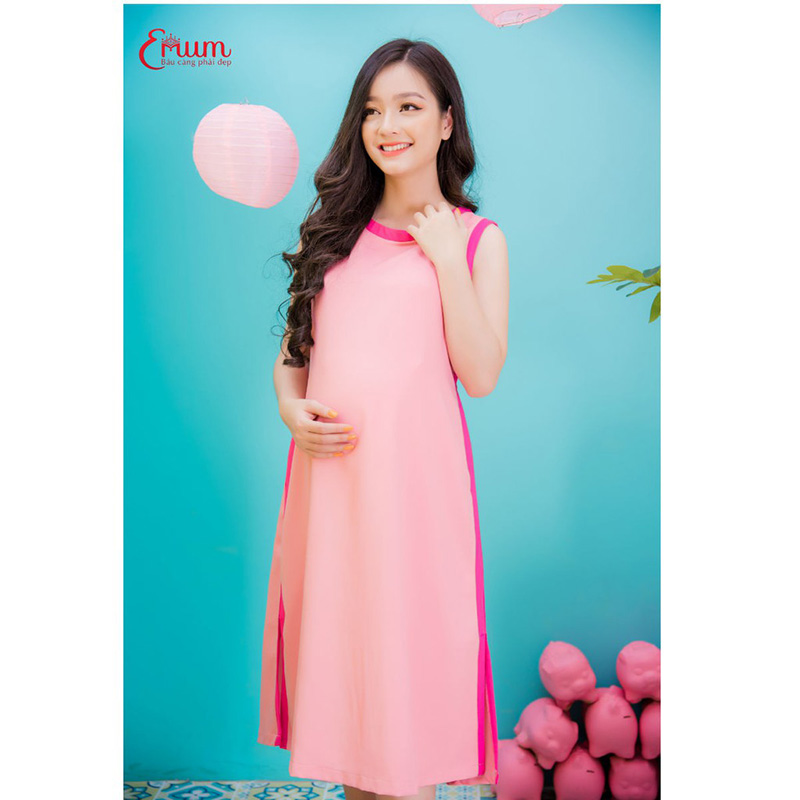Đầm bầu Emum sát nách phối viền xẻ tà hồng với thiết kế bo viền màu hồng đậm, đây là bộ đầm bầu phù hợp cho các Mẹ đi dự tiệc hoặc đi chơi cùng gia đình đều rất đẹp