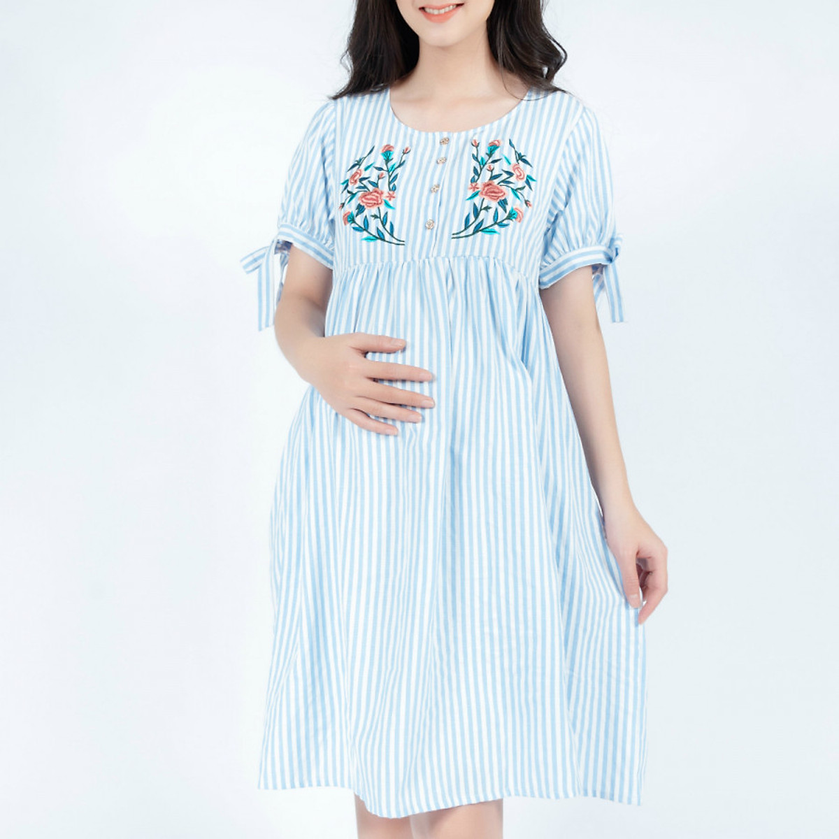 Đầm bầu xếp li thêu bông kẻ sọc Emum (xanh dương) với chất vải lụa kate với bề mặt mềm, mịn và mượt, suông, mang đến sự thoải mái và mát mẻ cho người mặc. Váy với dáng suông, thêu bông 2 bên ngực tạo điểm nhấn cho thiết kế, cho mẹ bầu luôn xinh xắn khi đi chơi hay đi làm.