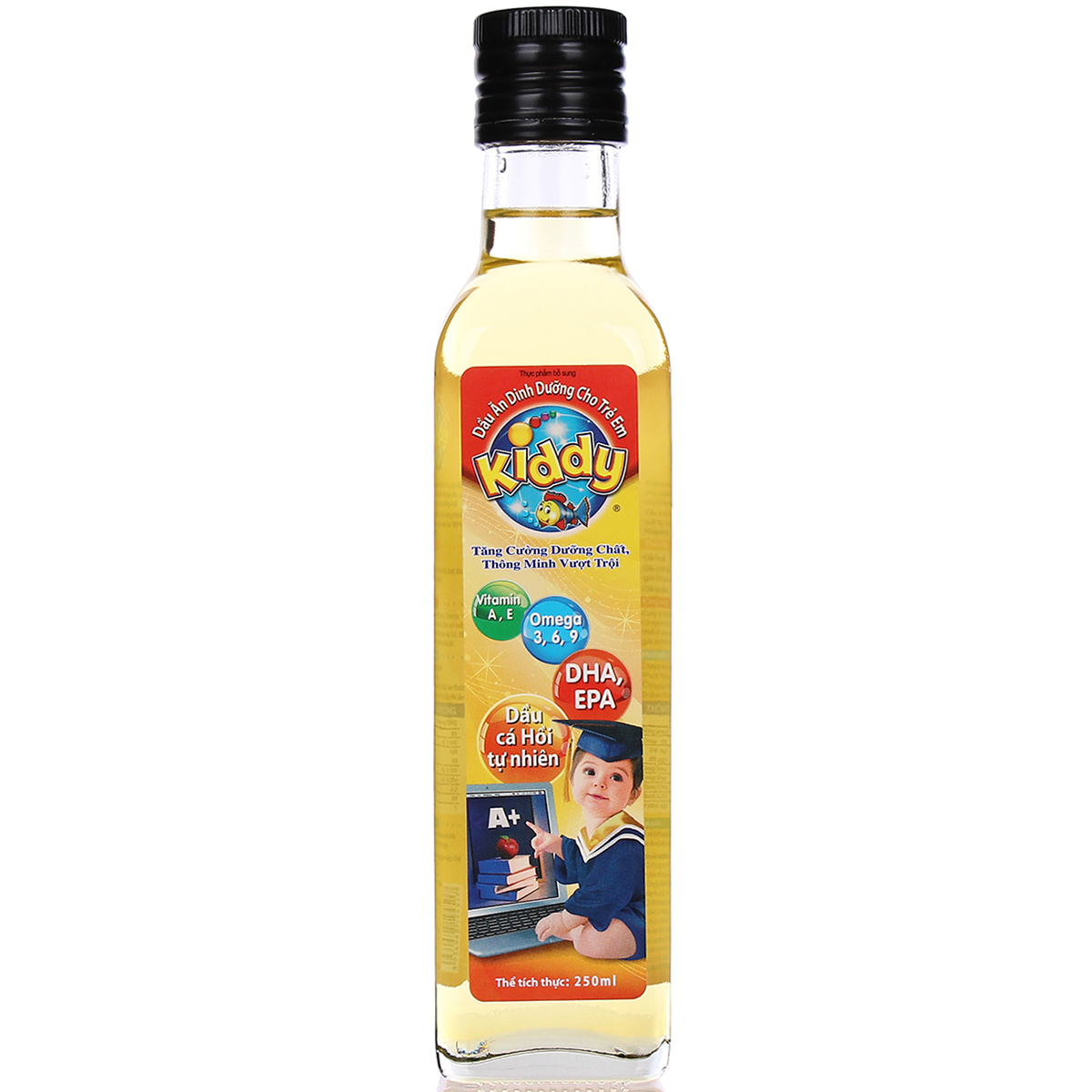 Dầu ăn Kiddy 250ml là dầu ăn dinh dưỡng dành cho trẻ em cao cấp, là sự kết hợp khoa học giữa dầu cá hồi nhập khẩu, dầu mè, dầu hạt cải và dầu gạo. Cung cấp cho bé yêu hàm lượng cao DHA tự nhiên từ dầu cá hồi, Omega 3, 6, 9; vitamin A, E và hơn 20 loại axit béo thiết yếu. Đặc biệt với công nghệ tinh chế hiện đại, giúp loại bỏ mùi tanh đặc trưng của dầu cá trong thành phẩm.