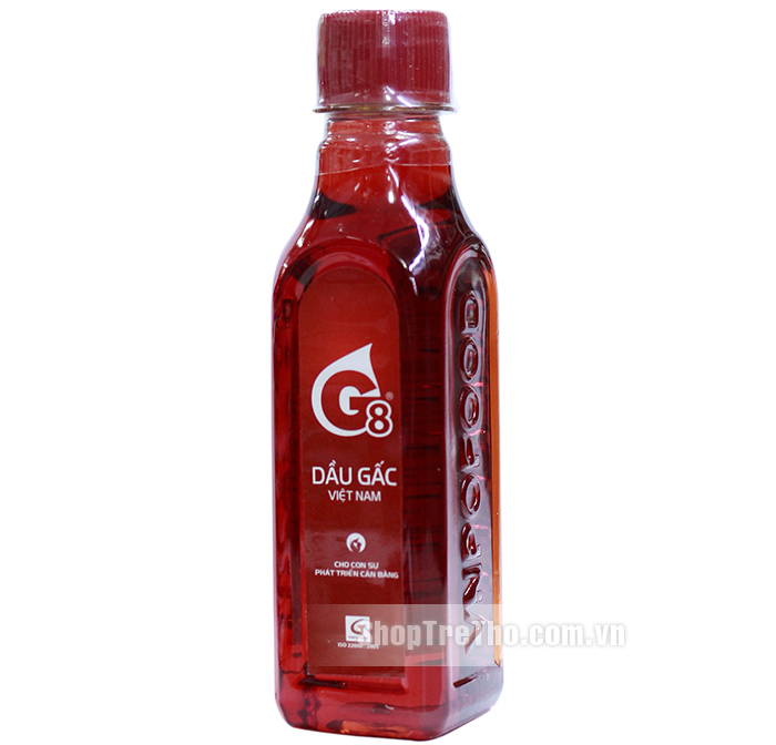 Dầu gấc Việt Nam G8 là dầu thực vật, được chiết xuất từ quả gấc Việt Nam, rất giàu vitamin A, E và các vi chất nên rất tốt cho trẻ trong độ tuổi ăn dặm. Các chất dinh dưỡng có trong dầu gấc sẽ giúp các bé bổ sung dinh dưỡng cho mắt, giúp mắt sáng và khỏe ngay từ những ngày đầu ăn dặm. Dầu gấc G8 giúp bé tăng cường sức đề kháng, da dẻ hồng hào, ăn ngon miệng và phát triển chiều cao.