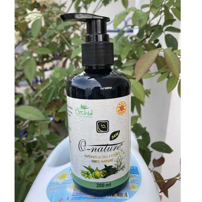 Dầu gội thảo dược O-Nature 200ml với thành phần tự nhiên như bồ kết, lá hoàng bá, móng rồng, cỏ mần trầu, cỏ ngũ sắc, giúp mái tóc bóng mượt, sạch gầu, chắc khỏe, không bị rụng và chẻ ngọn.