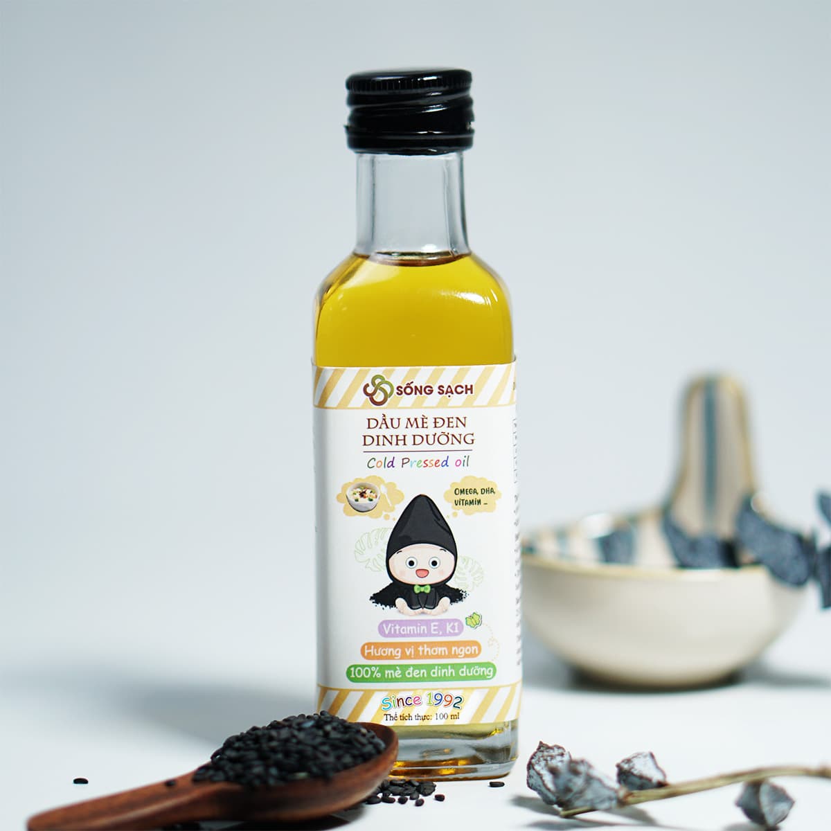- Dầu mè đen dinh dưỡng Sống Sạch là sản phẩm được ép lạnh hoàn toàn, giữ được lượng chất dinh dưỡng cao của mè đen