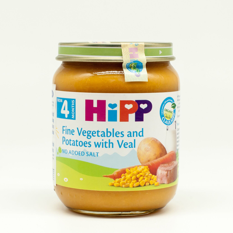 Thực phẩm bổ sung dinh dưỡng đóng lọ HiPP gồm rau sạch 63% (cà rốt, khoai tây, ngô ngọt 13%), sữa, nước, thịt bê sạch 8,4%, dầu hạt cải 1,3%. Sản phẩm là thức ăn dặm bồi bổ cơ thể cho trẻ nhỏ từ 4 tháng tuổi trở lên, bổ sung năng lượng trong giai đoạn tăng trưởng và phát triển, cung cấp đạm tự nhiên ở dạng dễ hấp thụ nhất cho trẻ.