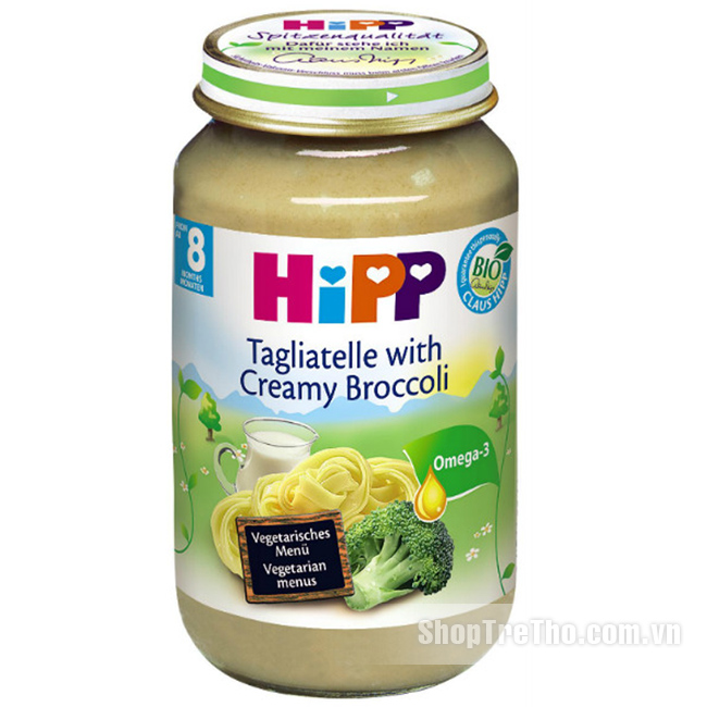 Dinh dưỡng đóng lọ HIPP mỳ Tagliatelle kèm lơ xanh 220g bao gồm sữa ít béo, mì ống 25% (lúa mì cứng), nước, carot, tinh lõi gạo, lơ xanh 5%, kem 4%, hành, dầu hạt cải 1,2%, nước chanh ép cô đặc, muối i-ốt