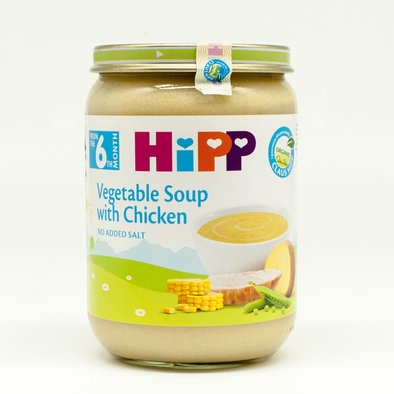 Dinh dưỡng đóng lọ HiPP sạch - Súp rau thịt gà 190g gồm 37% rau tổng hợp (ngô ngọt, khoai tây, đậu), cháo gạo, thịt gà 8%, dầu hạt cải dầu 1,3%, lá thơm, là thức ăn dặm bồi bổ cơ thể cho trẻ từ tháng thứ 6 trở lên, cung cấp đạm và chất sắt tự nhiên cho trẻ, thực phẩm rất nhuận tràng.