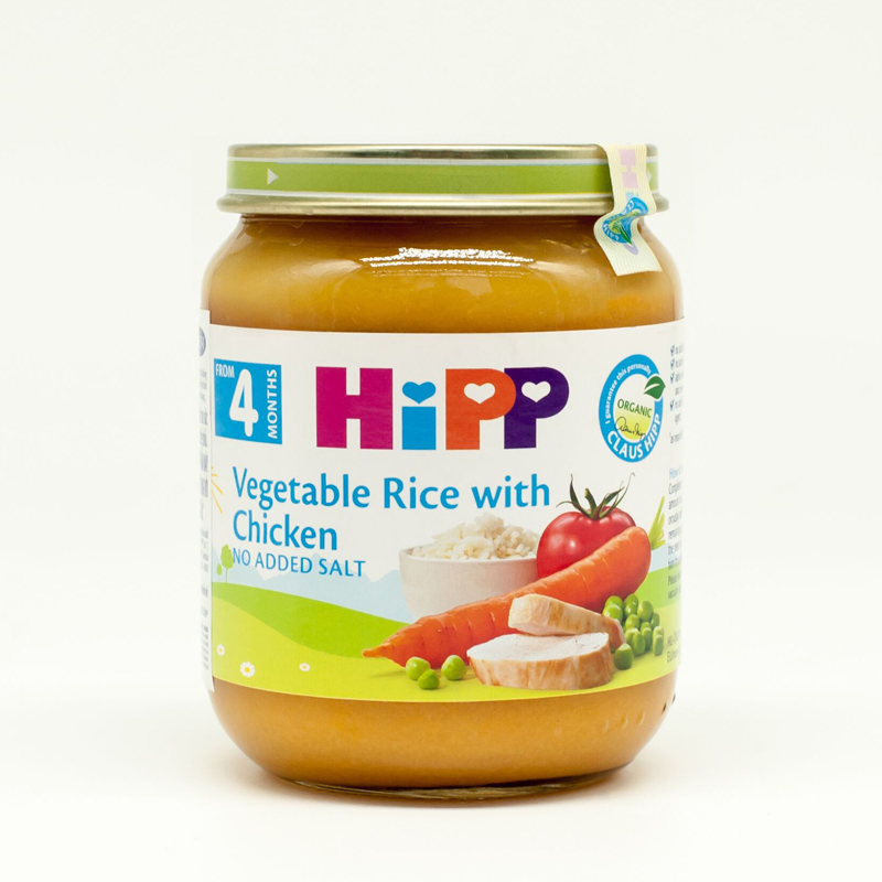 Dinh dưỡng đóng lọ HiPP thịt gà, cơm nhuyễn và rau tổng hợp (125g) dành cho trẻ từ 4 tháng tuổi trở lên. Khi bắt đầu tập ăn dặm mẹ nên cho bé ăn các món ăn ngọt (tinh bột, sữa, hoa quả dầm, hoa quả tươi..). Sau đó các mẹ cho bé chuyển qua ăn các món mặn (thịt, cá, tôm...). Thức ăn đóng lọ Hipp cho bé chứa thành phần dinh dưỡng cần thiết cho trẻ trong giai đoạn sử dụng thức ăn dặm cho bé.