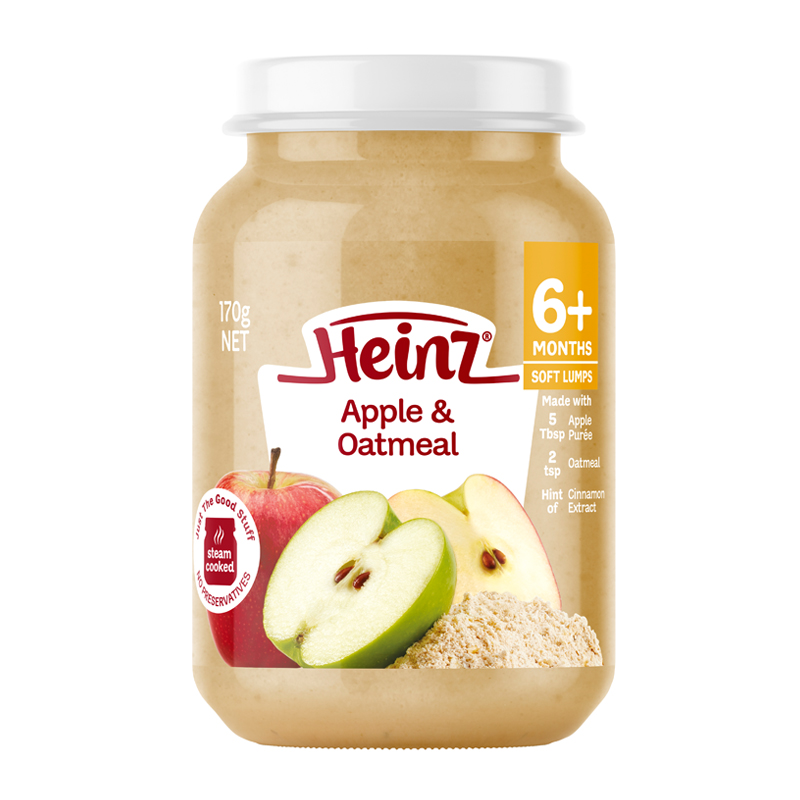 - Táo và yến mạch nghiền Heinz là thức ăn dặm được chế biến sẵn dành cho bé từ 6 tháng tuổi