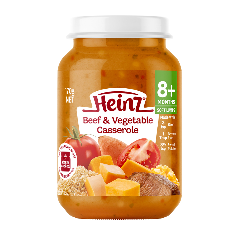 Thịt bò hầm và rau củ nghiền Heinz là thức ăn dặm được chế biến sẵn dành cho bé từ 8 tháng tuổi