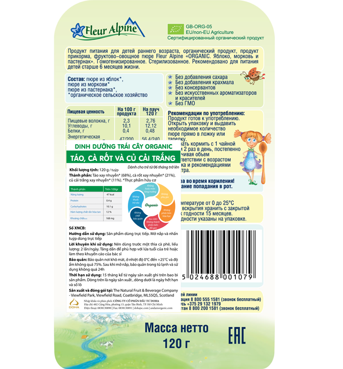 - Thành phần: Táo xay nhuyễn* (68%), cà rốt xay nhuyễn* (21%), củ cải trắng xay nhuyễn* (11%). * Thực phẩm hữu cơ.