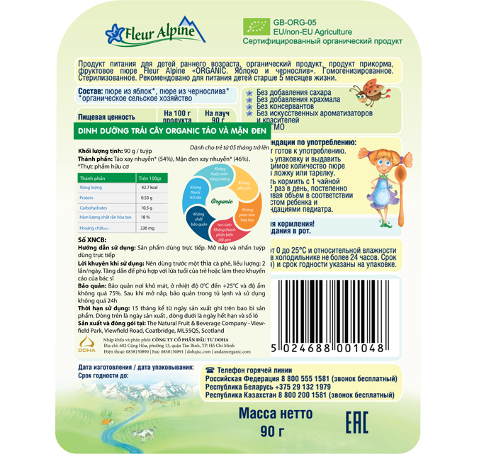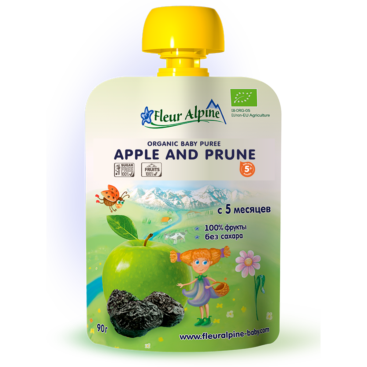 - Thành phần: Táo xay nhuyễn*(54%), Mận đen xay nhuyễn*(46%). * Thực phẩm hữu cơ.