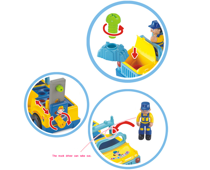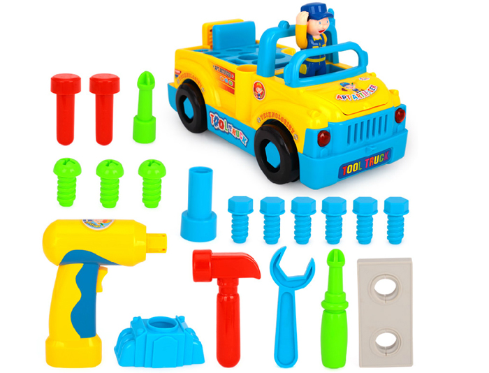 - Ô tô đồ chơi với các chi tiết có thể tháo rời như: bánh xe, lái xe, các chi tiết phía sau thùng xe....