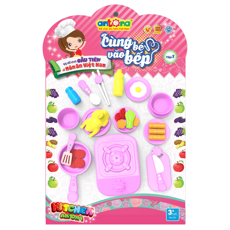 Đồ chơi Antona No.255 - Cùng bé vào bếp (màu hồng) được thiết kế mô phỏng theo các món ăn Việt và dụng cụ nhà bếp như nồi chảo, bếp nấu, gà luộc, trứng rán... Qua đó, bé sẽ được trang bị những kỹ năng cơ bản trước khi sử dụng các vật dụng nhà bếp của mẹ và những bí kíp nhỏ để món ăn thêm ngon và hấp dẫn hơn.