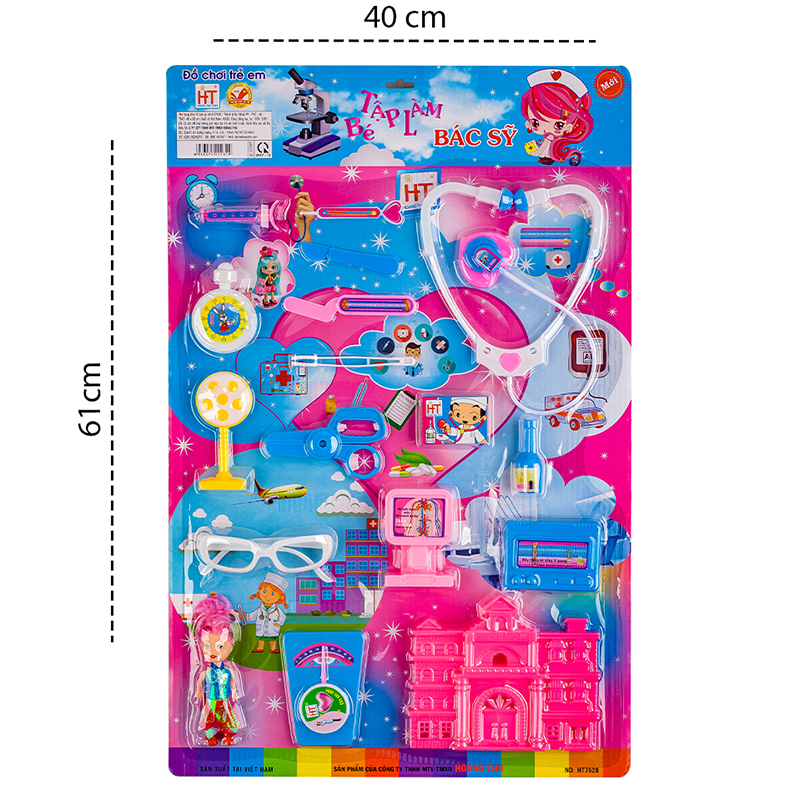 Đồ chơi Bác sĩ HT7628 gồm những thiết bị y tế quen thuộc với các bác sĩ như: Kim tiêm, kéo, ống nghe, dao, kéo… để bé chơi trò bác sĩ bệnh nhân đầy thú vị, Đồng thời đồ chơi cũng giúp trẻ hiểu hơn về nghề bác sĩ cũng như không còn lo sợ khi đi khám bệnh.